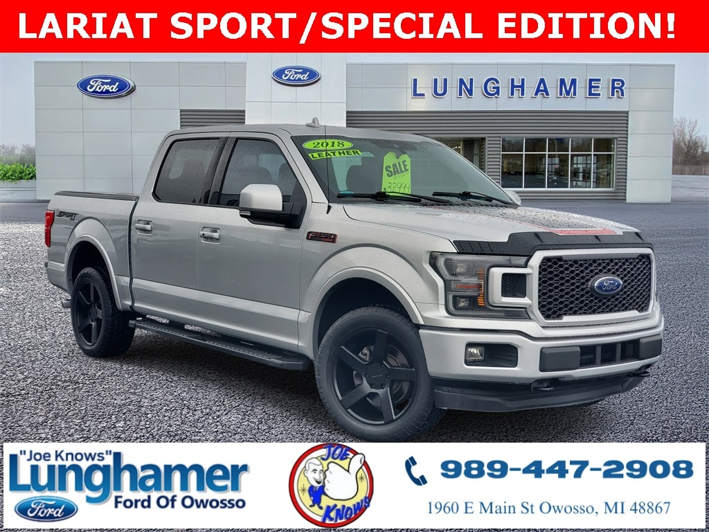 Ingot Silver Metallic 2018 Ford F-150 Lariat 4WD 10-Speed Automatic 3.5L V6 EcoBoost 2018 Ford F-150, *4X4*, *LEATHER*, *HEATED SEATS*, *COOLED SEATS*, *REMOTE START*, *BACK UP CAMERA*, LARIAT SPECIAL EDITION!, LARIAT SPORT APPEARANCE PKG!, TRAILER TOW PKG!, F-150 Lariat, 4D SuperCrew, 3.5L V6 EcoBoost, 10-Speed Automatic, 4WD, Ingot Silver Metallic, Black w/Unique Special Edition 40/Console/40 Front Seats, 110V/400W Outlet, 2-Bar Body-Color Grille w/4 Minor Bars, 2nd Row Heated Seats, Accent-Color Angular Step Bars, Adjustable pedals, Air Conditioning, AppLink/Apple CarPlay and Android Auto, Automatic High Beam w/Rain-Sensing Wipers, Automatic temperature control, Black Running Boards, BLIS Blind Spot Information System, Body-Color Front & Rear Bumpers, Body-Color Surround Grille w/Tarnished Dark Mesh, Box Side Decals, Class IV Trailer Hitch Receiver, Electronic Locking w/3.31 Axle Ratio, Equipment Group 502A Luxury, Extended Range 36 Gallon Fuel Tank, Exterior Parking Camera Rear, Front dual zone A/C, Front fog lights, Fully automatic headlights, GVWR: 7,000 lbs Payload Package, Heated front seats, Heated Steering Wheel, Higher-Capacity Radiator, Higher-Power Cooling Fans, Integrated Trailer Brake Controller, Lariat Special Edition Package, Lariat Sport Appearance Package, Leather-Trimmed Bucket Seats, LED Sideview Mirror Spotlights, Memory seat, Pedal memory, Power driver seat, Power Glass Sideview Mirr w/Chrome Skull Caps, Power passenger seat, Power Tilt/Telescoping Steering Column w/Memory, Power windows, Pro Trailer Backup Assist, Quad Beam LED Headlamps & LED Taillamps/Fog Lamps, Radio: B&O Play Premium Audio System, Radio: Single-CD/SiriusXM w/7 Speakers, Rear window defroster, Remote Start System w/Remote Tailgate Release, Reverse Sensing System, Single-Tip Chrome Exhaust, Speed control, SYNC Connect, Telescoping steering wheel, Trailer Tow Package, Unique Bodyside & Hood Decals, Unique Special Edition 40/Console/40 Front Seats, Universal Garage Door Opener, Upgraded Front Stabilizer Bar, Ventilated front seats, Voice-Activated Touchscreen Navigation System, Wheels: 20" Unique Premium Tarnished Dark Painted, Windshield Wiper De-Icer.